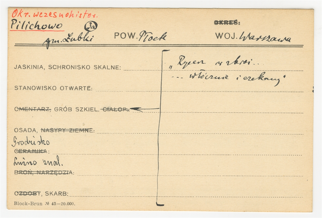 Karta stanowiska "Pilichowo gm. Łubki pow. Płock woj. Warszawa" (druk rękopis) - strona 1