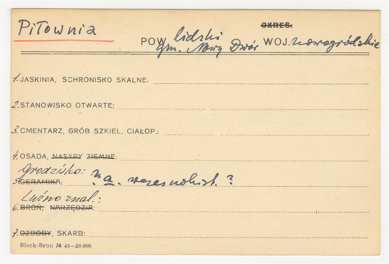 Karta stanowiska "Piłownia gm. Nowy Dwór pow. lidzki woj. nowogródzkie" (druk rękopis) - strona 1