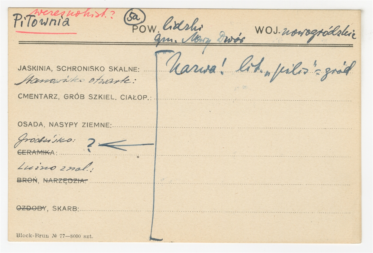 Karta stanowiska "Piłownia gm. Nowy Dwór pow. lidzki woj. nowogródzkie" (druk rękopis) - strona 1