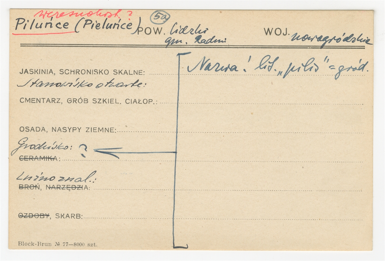 Karta stanowiska "Piluńce (Pieluńce) gm. Raduń pow. lidzki woj. nowogródzkie" (druk rękopis) - strona 1
