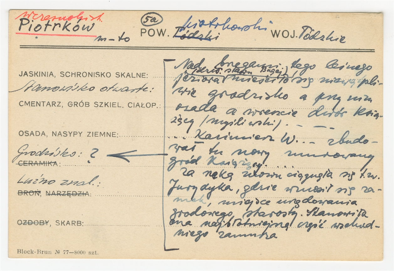 Karta stanowiska "Piotrków m-to pow. łódzki [skreślone] piotrkowski woj. łódzkie" (druk rękopis) - strona 1