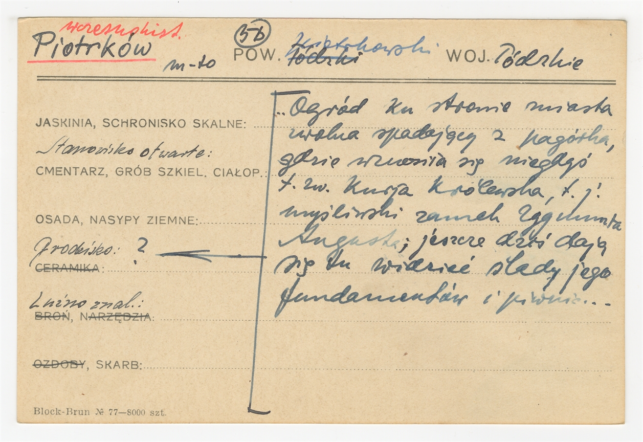Karta stanowiska "Piotrków m-to pow. łódzki [skreślone] piotrkowski woj. łódzkie" (druk rękopis) - strona 1