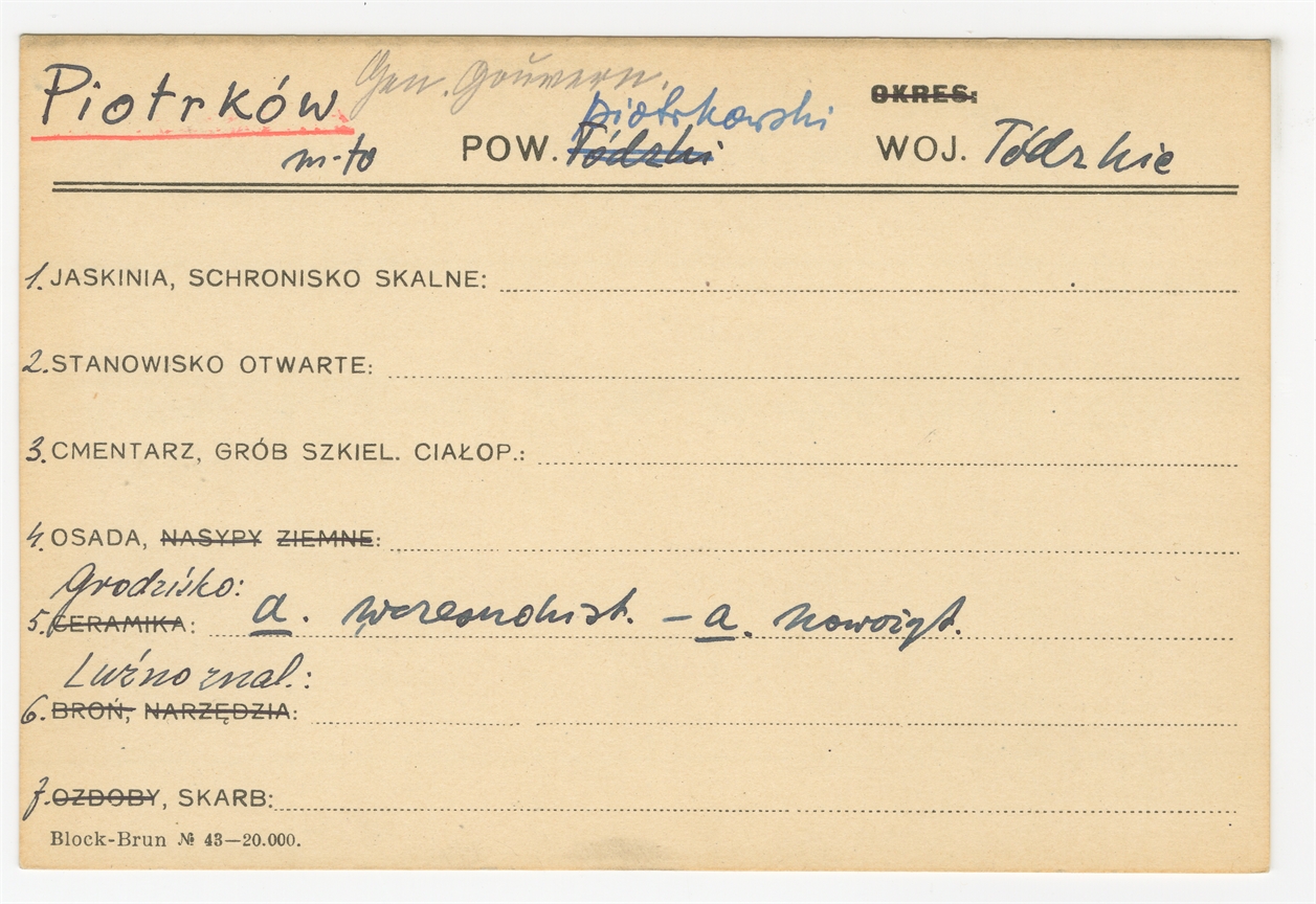 Karta stanowiska "Piotrków m-to pow. łódzki [skreślone] piotrkowski woj. łódzkie" (druk rękopis) - strona 1