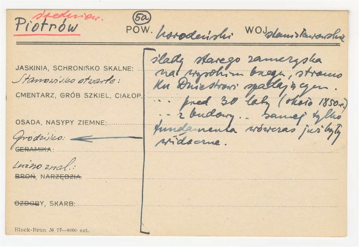 Karta stanowiska "Piotrów pow. horodeński woj. stanisławowskie" (druk rękopis) - strona 1