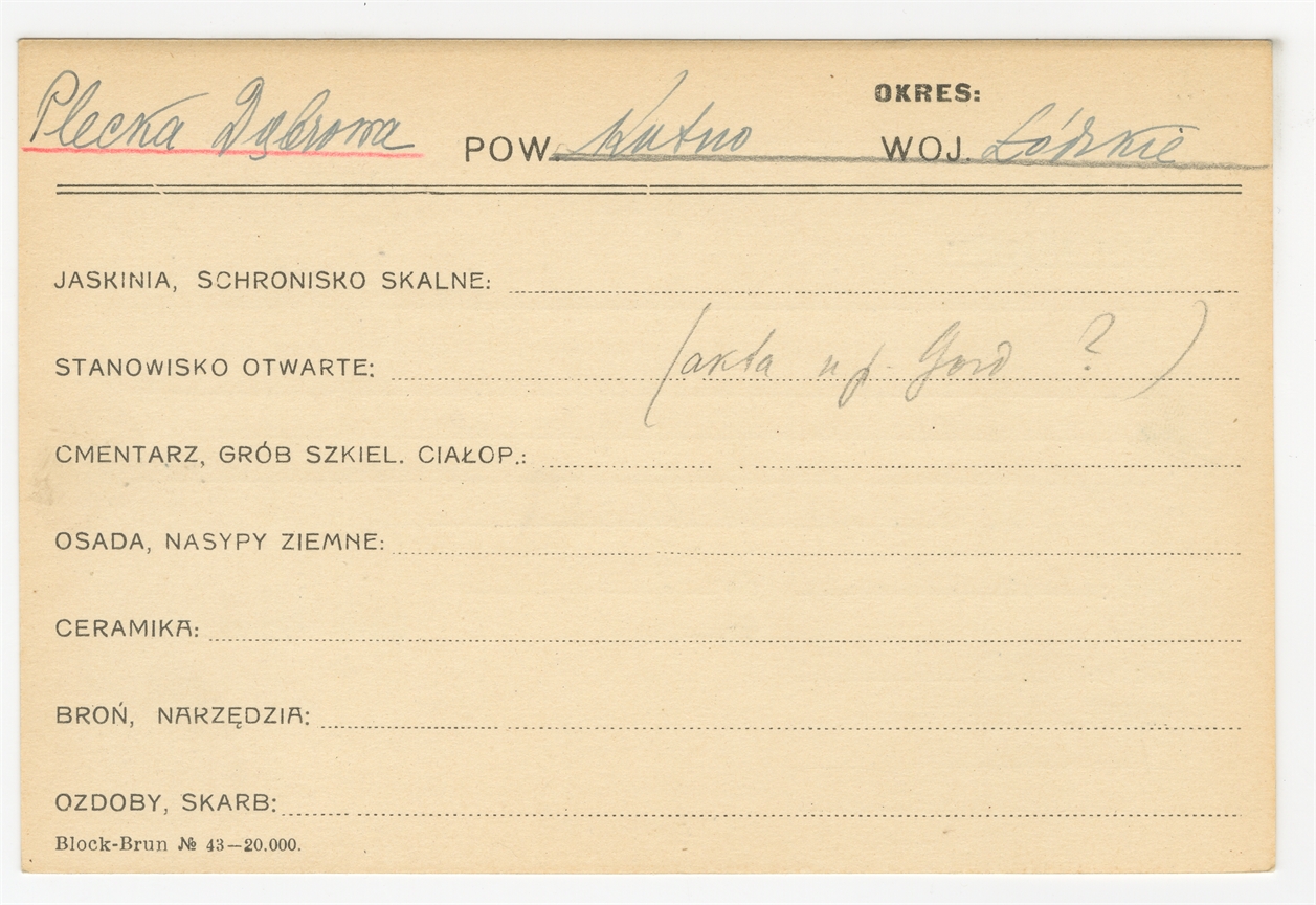 Karta stanowiska "Plecka Dąbrowa pow. Kutno woj. Łódzkie" (druk rękopis) - strona 1