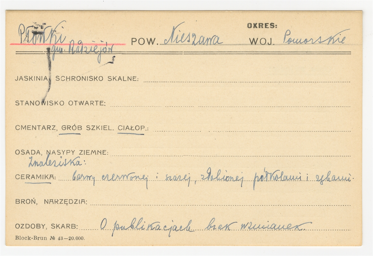 Karta stanowiska "Płonki gm. Radziejów pow. Nieszawa woj. Pomorskie" (druk rękopis) - strona 1