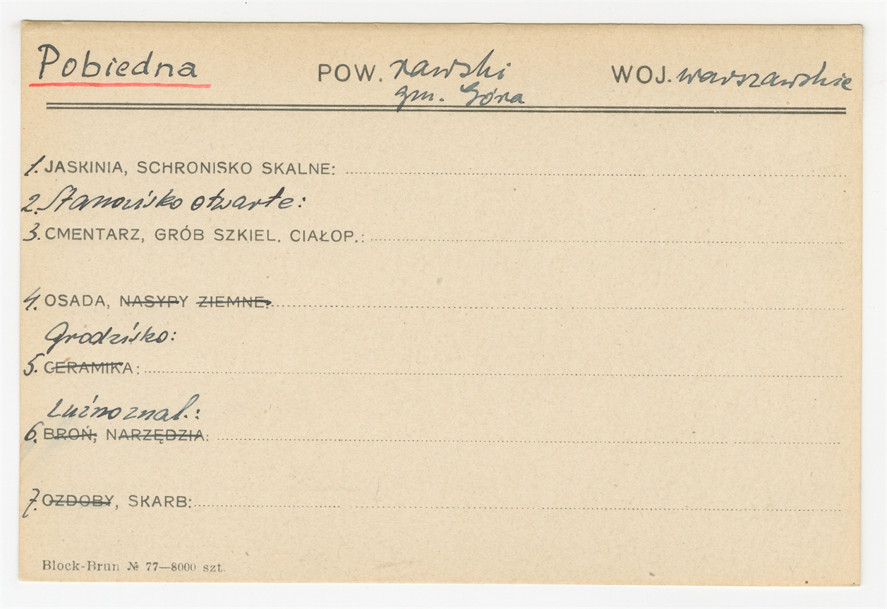 Karta stanowiska "Pobiedna gm. Góra pow. rawski woj. warszawskie" (druk rękopis) - strona 1