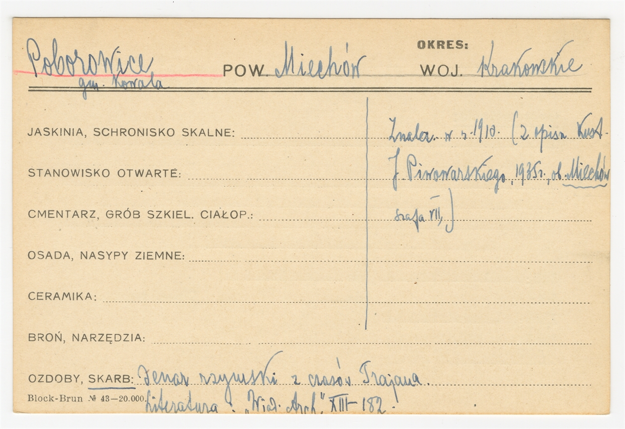 Karta stanowiska "Poborowice gm. Kowala pow. Miechów woj. Krakowskie" (druk rękopis) - strona 1