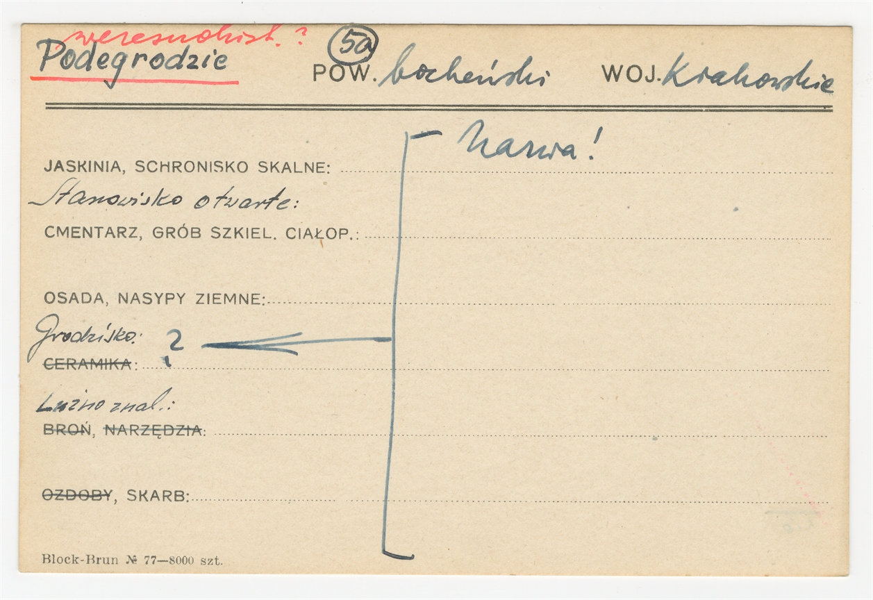 Karta stanowiska "Podegrodzie pow. bocheński woj. krakowskie" (druk rękopis) - strona 1