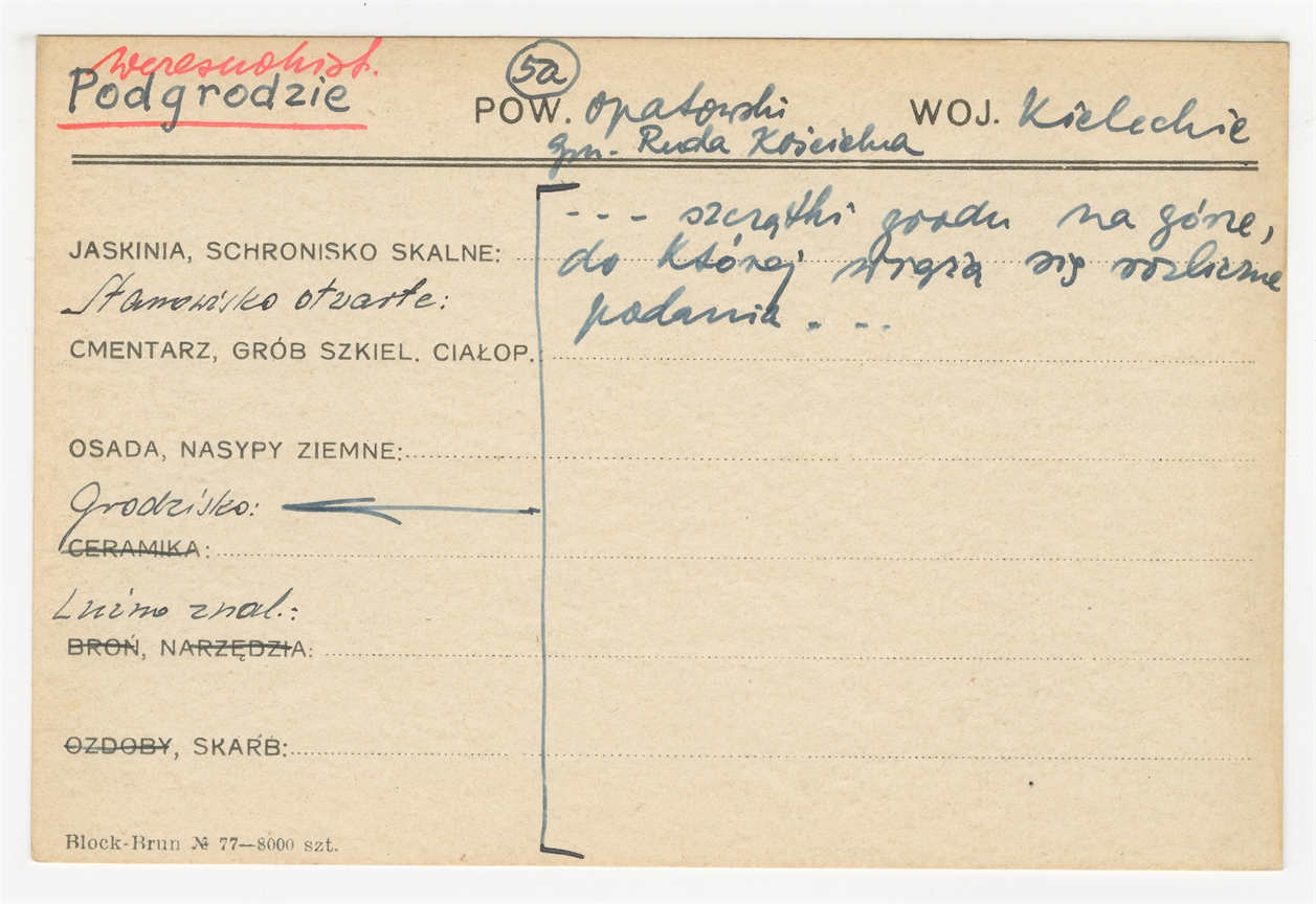 Karta stanowiska "Podgrodzie gm. Ruda Kościelna pow. Opatowski woj. Kieleckie" (druk rękopis) - strona 1