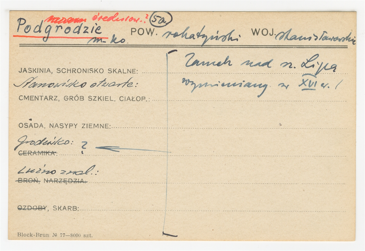 Karta stanowiska "Podgrodzie m-ko pow. rohatyński woj. stanisławowskie" (druk rękopis) - strona 1