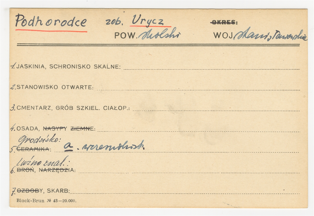 Karta stanowiska "Podhorodce zob. Urycz pow. skolski woj. stanisławowskie" (druk rękopis) - strona 1