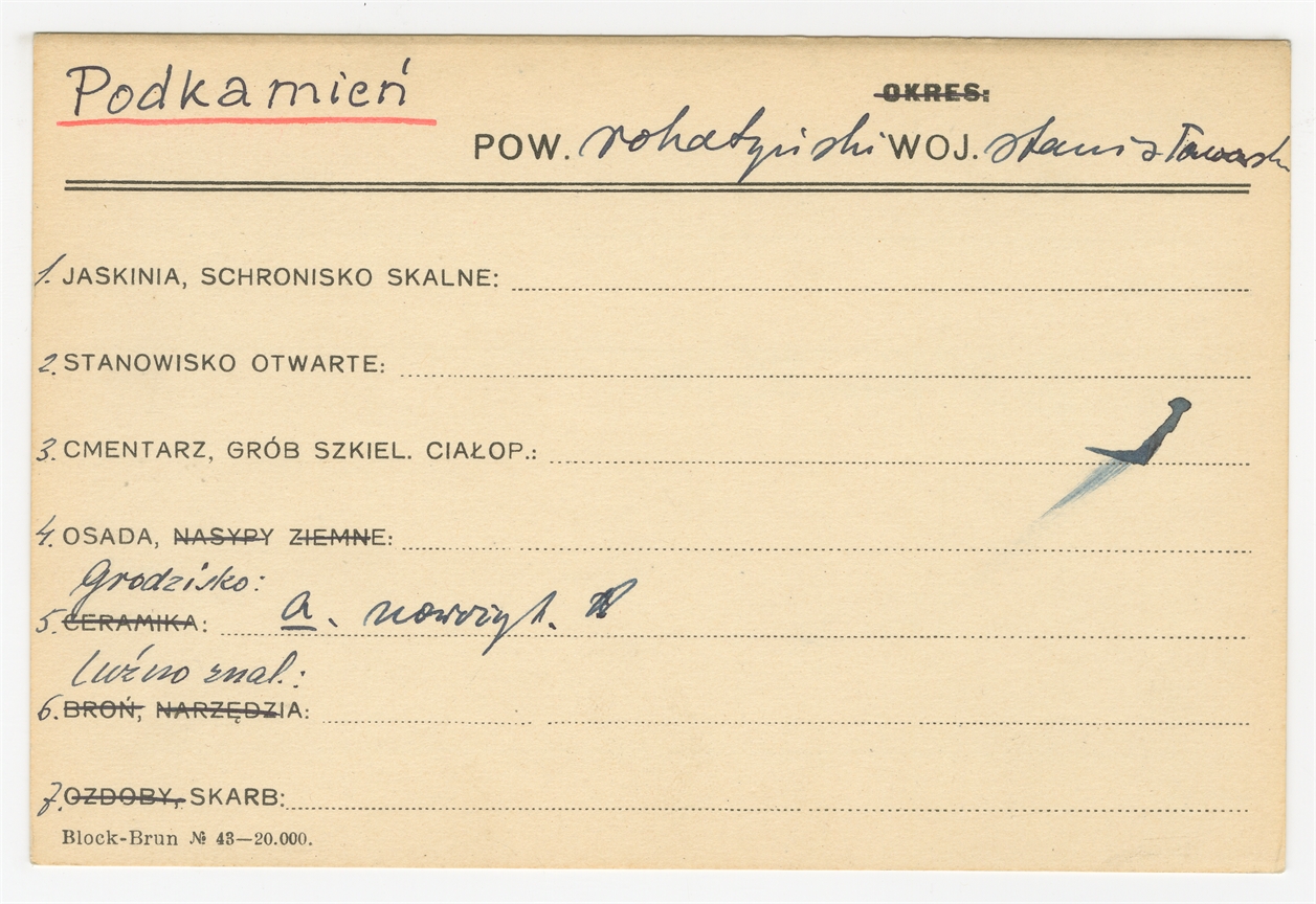 Karta stanowiska "Podkamień pow. rohatyński woj. stanisławowskie" (druk rękopis) - strona 1