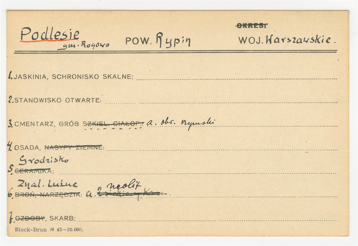 Karta stanowiska "Podlesie gm. Rogowo pow. Rypin woj. Warszawskie" (druk rękopis) - strona 1