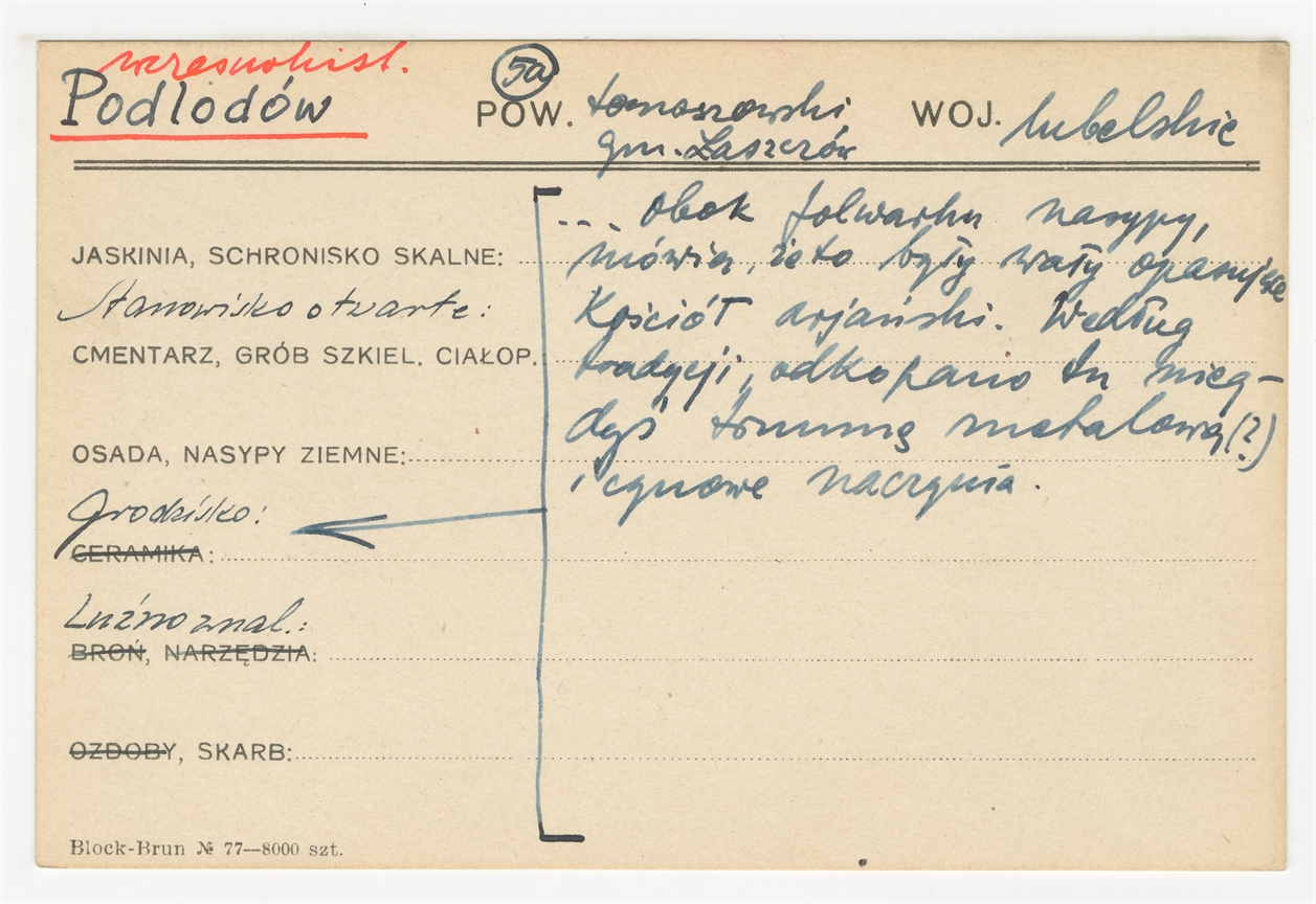 Karta stanowiska "Podlodów gm. Łaszczów pow. tomaszowski woj. lubelskie" (druk rękopis) - strona 1