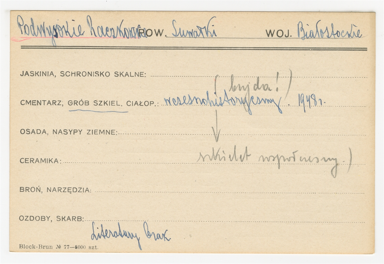 Karta stanowiska "Podwysokie Raczkowskie pow. Suwałki woj. Białostockie" (druk rękopis) - strona 1