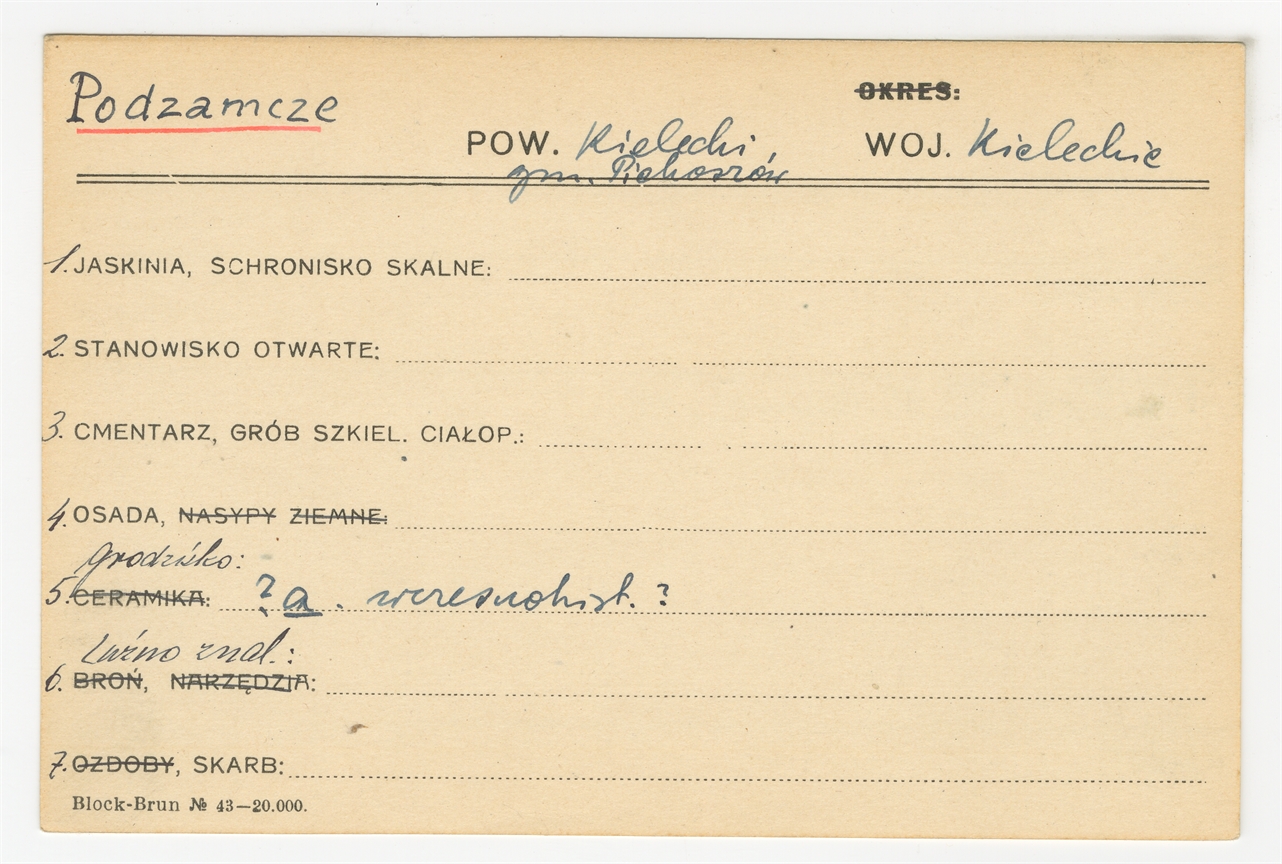 Element 1 - Karta stanowiska "Podzamcze gm. Piekoszów pow. kielecki woj. kieleckie" (druk rękopis) - strona 1