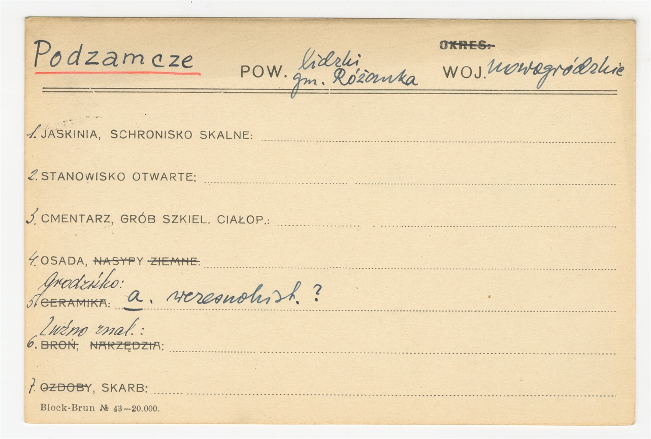 Element 1 - Karta stanowiska "Podzamcze gm. Różanka pow. lidzki woj. nowogródzki" (druk rękopis) - strona 1