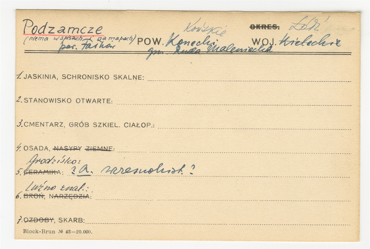 Karta stanowiska "Podzamcze (niema w spisach i na mapach) par. Fałków gm. Ruda Maleniecka pow. Konecki Końskie woj. Kieleckie [skreślone] Łódź" (druk rękopis) - strona 1