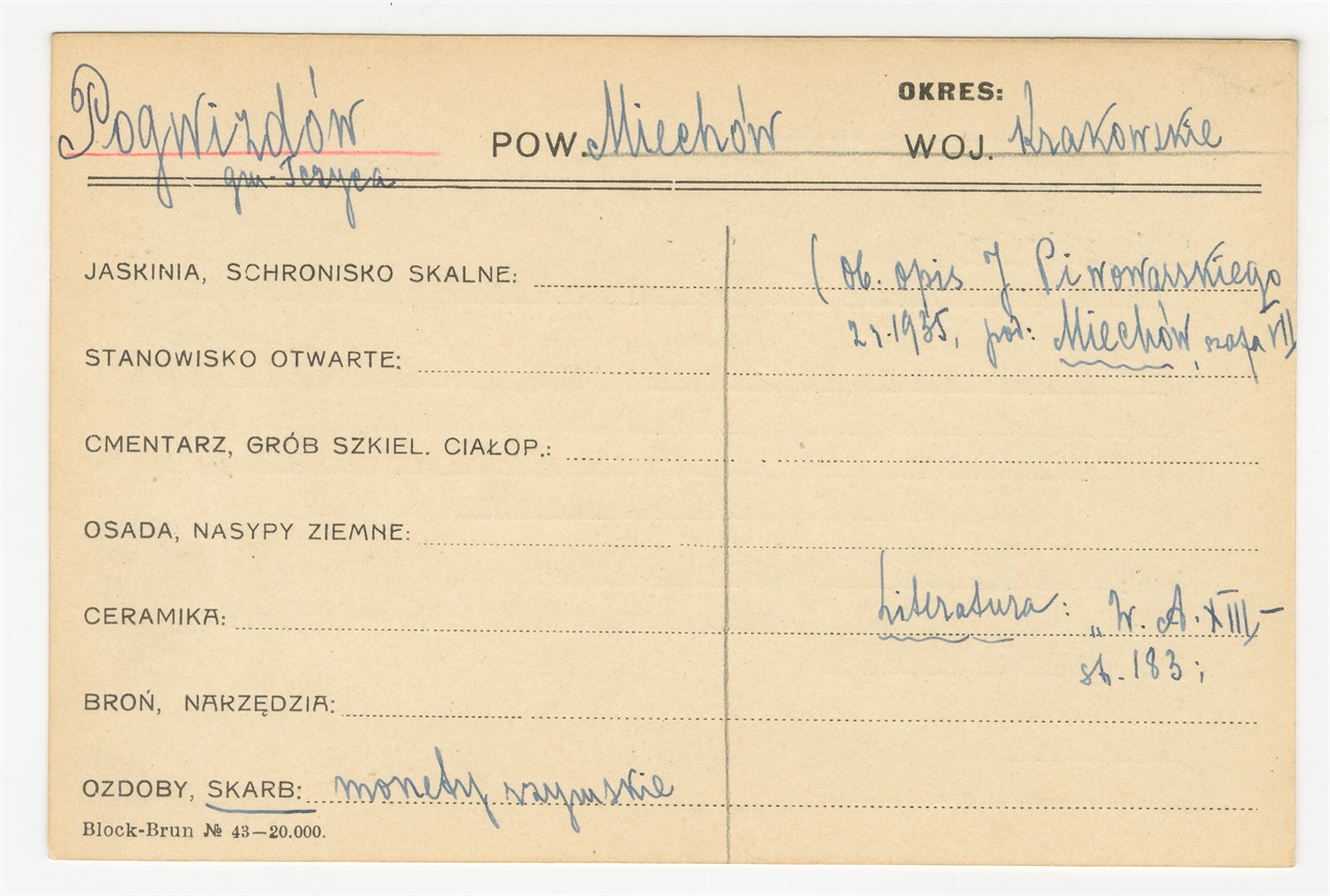 Karta stanowiska "Pogwizdów gm. Tczyca pow. Miechów woj. Krakowskie" (druk rękopis) - strona 1