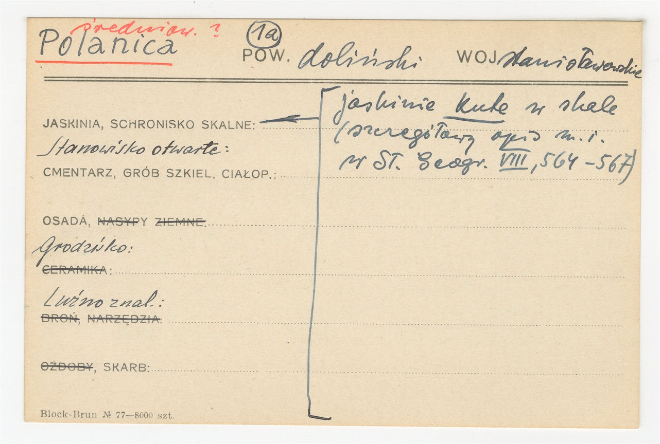 Karta stanowiska "Polanica pow. doliński woj. stanisławowskie" (druk rękopis) - strona 1