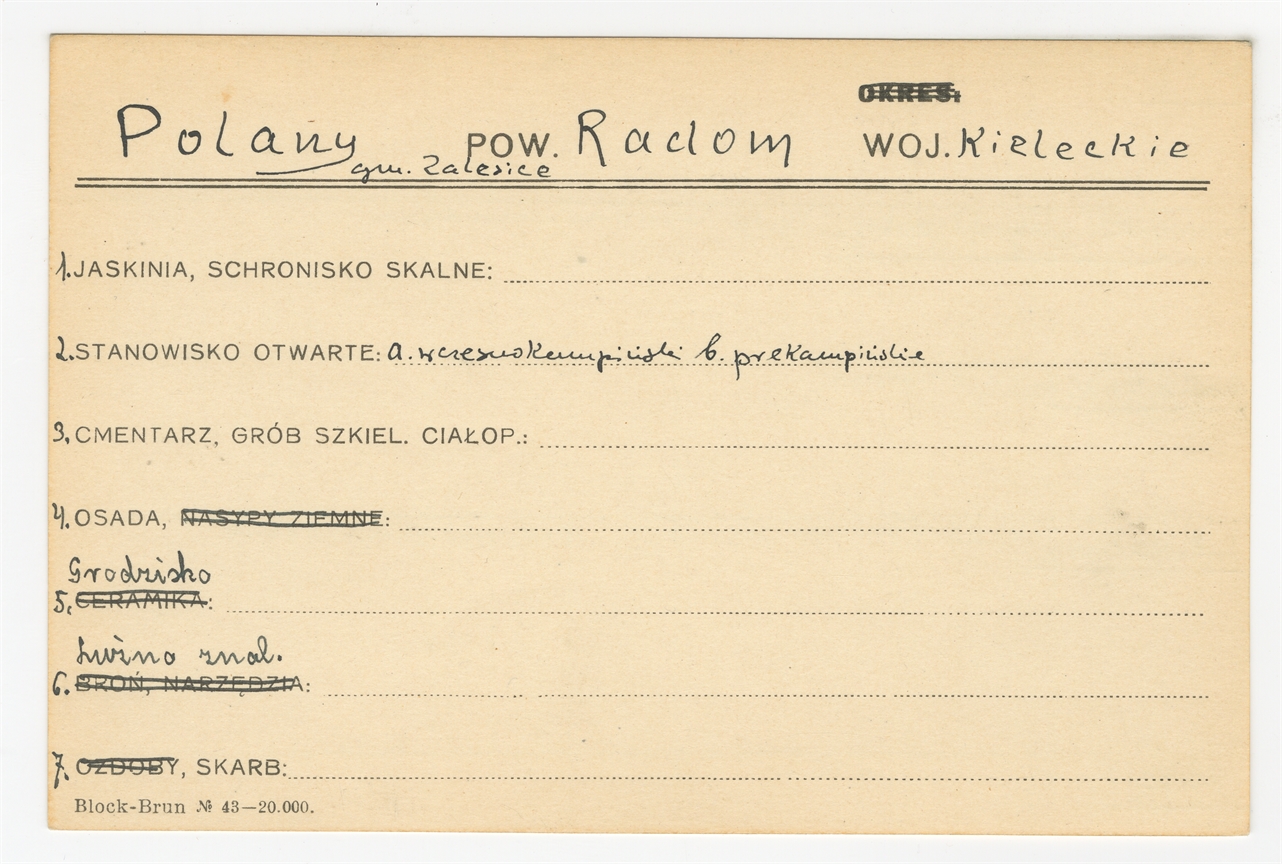Karta stanowiska "Polany gm. Zalesice pow. Radom woj. Kieleckie" (druk rękopis) - strona 1