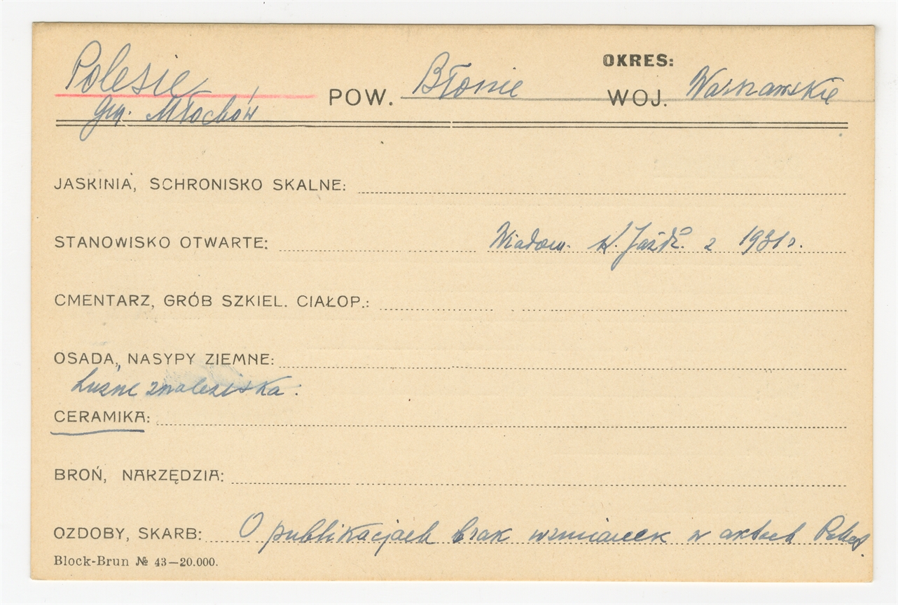 Karta stanowiska "Polesie gm. Młochów pow. Błonie woj. Warszawskie" (druk rękopis) - strona 1
