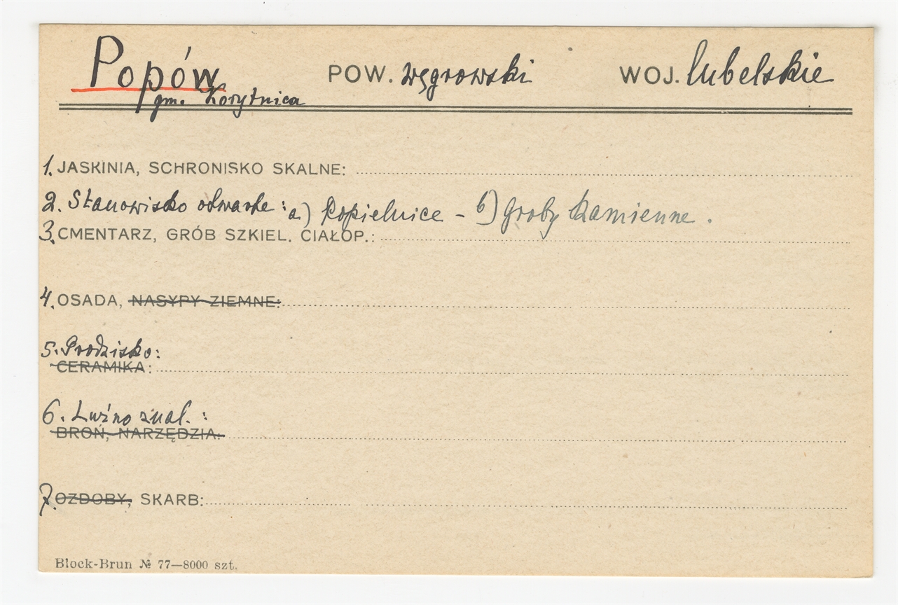 Karta stanowiska "Popów gm. Korytnica pow. Węgrów woj. Lubelskie" (druk rękopis) - strona 1