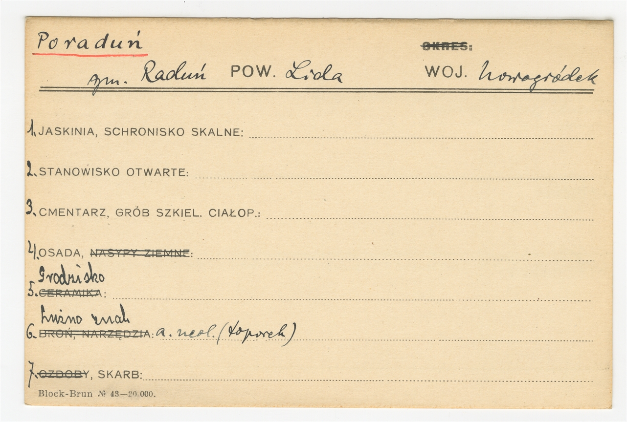 Karta stanowiska "Poraduń gm. Raduń pow. Lida woj. nowogródek" (druk rękopis) - strona 1