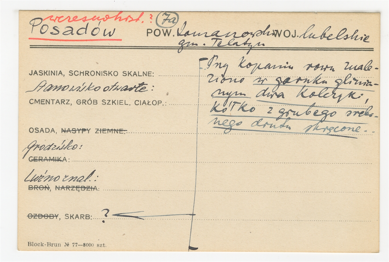 Karta stanowiska "Posadów gm. Telatyn pow. tomaszowski woj. lubelskie" (druk rękopis) - strona 1