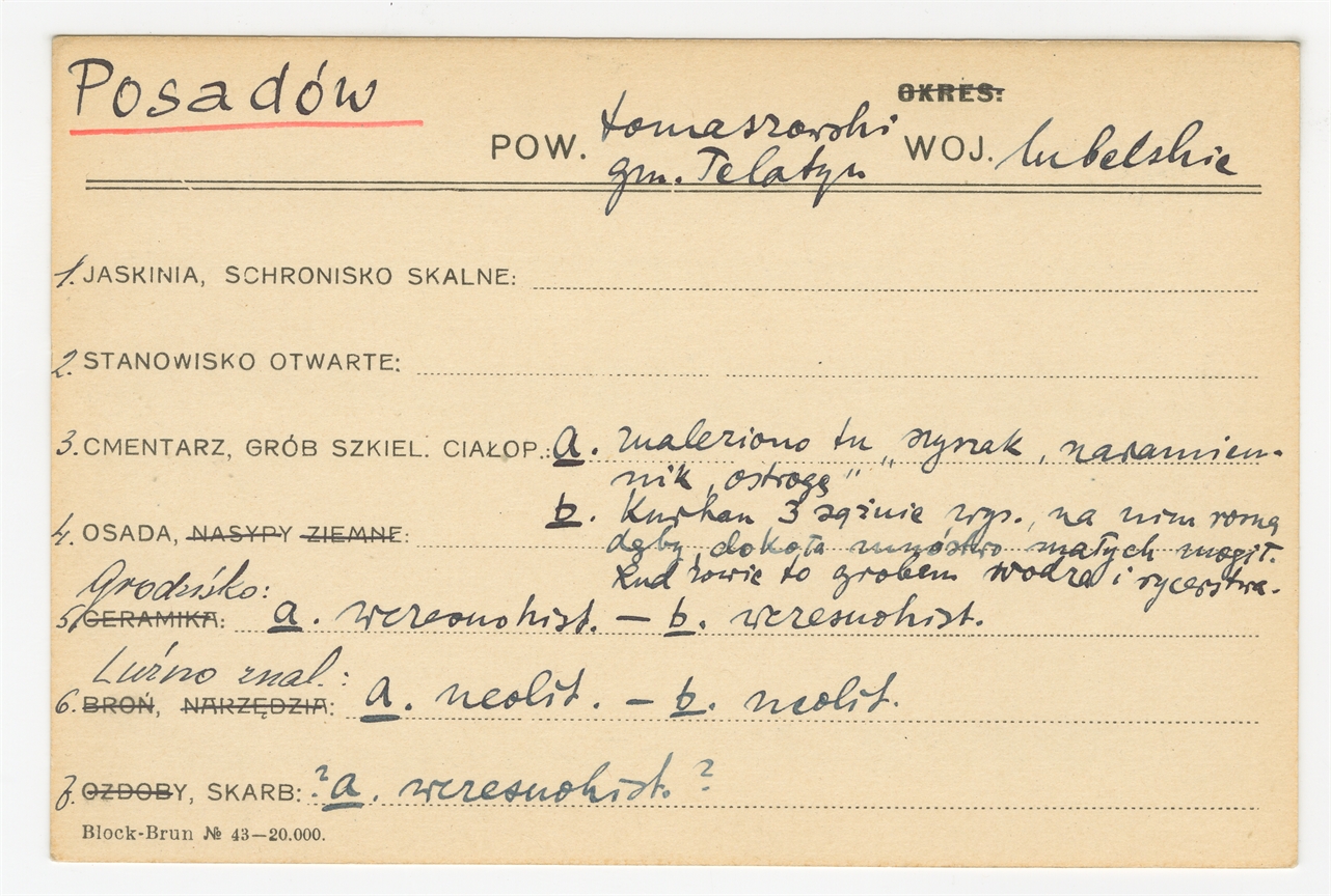 Karta stanowiska "Posadów gm. Telatyn pow. tomaszowski woj. lubelskie" (druk rękopis) - strona 1