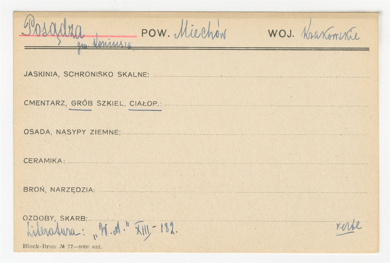 Karta stanowiska "Posądza gm. Koniusza pow. Miechów woj. Krakowskie" (druk rękopis) - strona 1