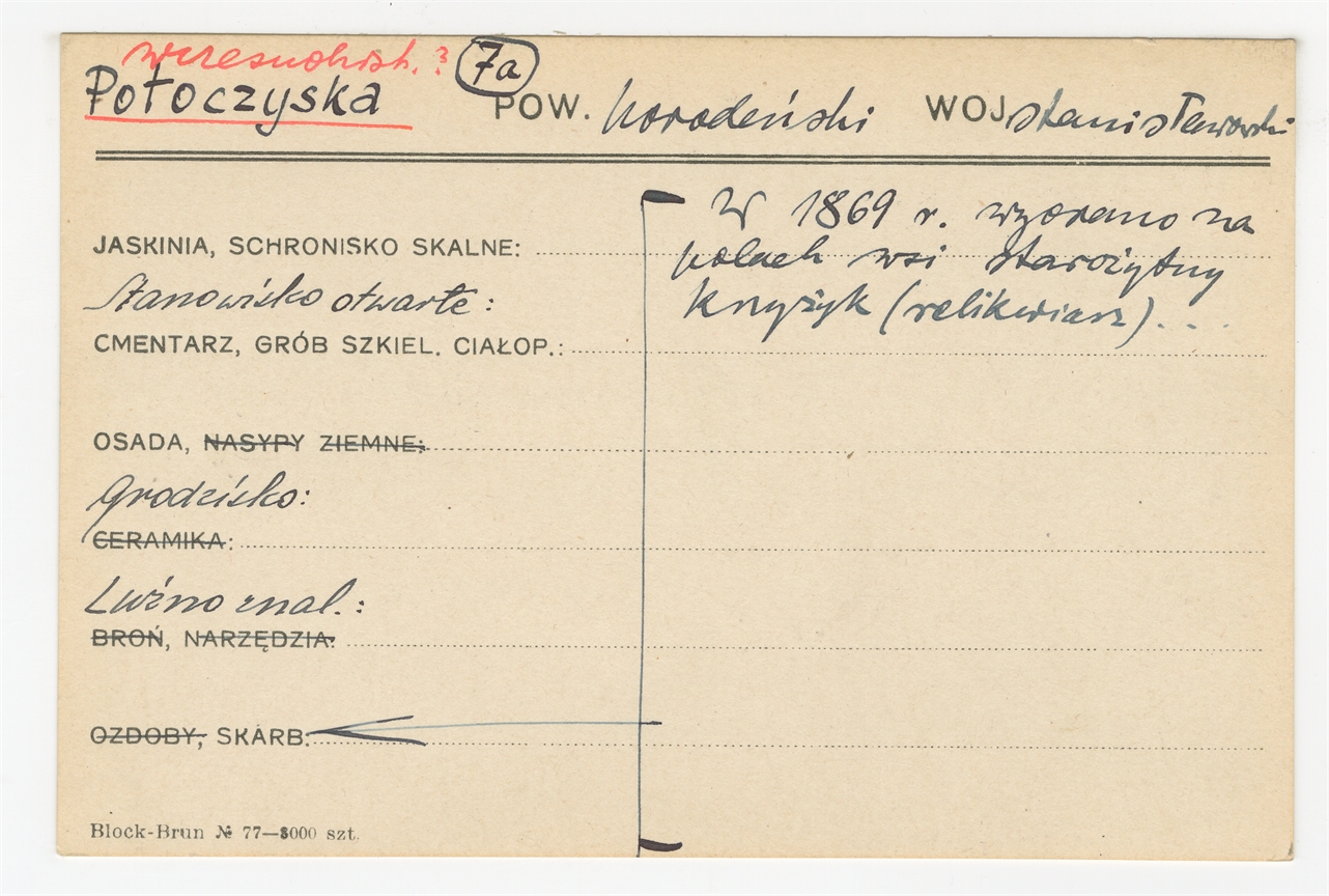 Karta stanowiska "Potoczyska pow. horodeński woj. stanisławowskie" (druk rękopis) - strona 1