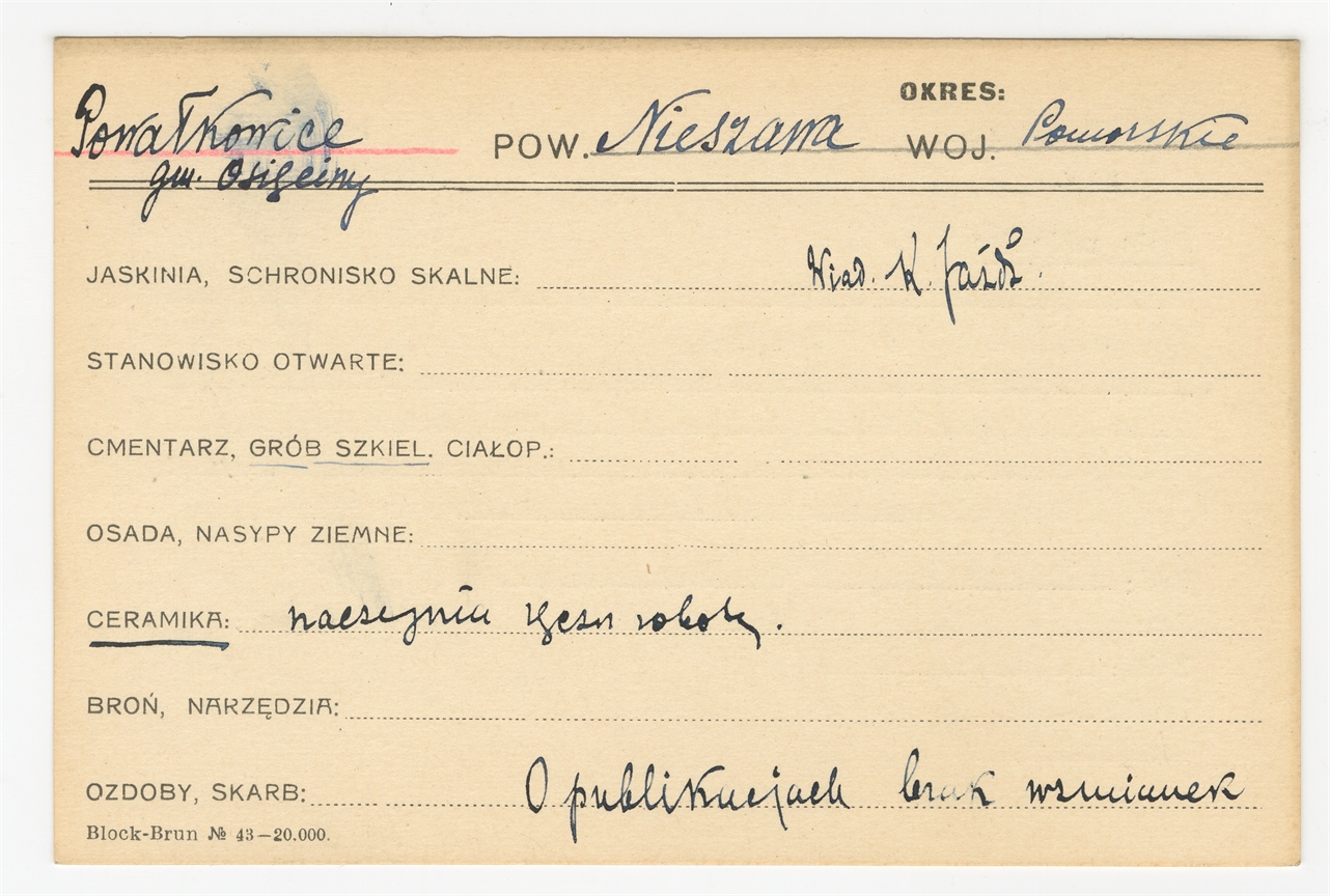 Karta stanowiska "Powałkowice gm. Osięciny pow. Nieszawa woj. Pomorskie" (druk rękopis) - strona 1