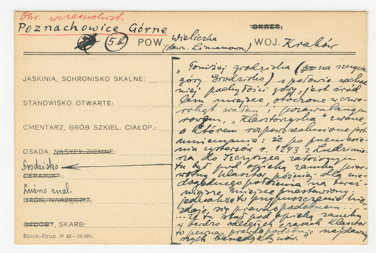 Karta stanowiska "Poznachowice Górne pow. Wieliczka (dawn. Limanowa) woj. Kraków" (druk rękopis) - strona 1