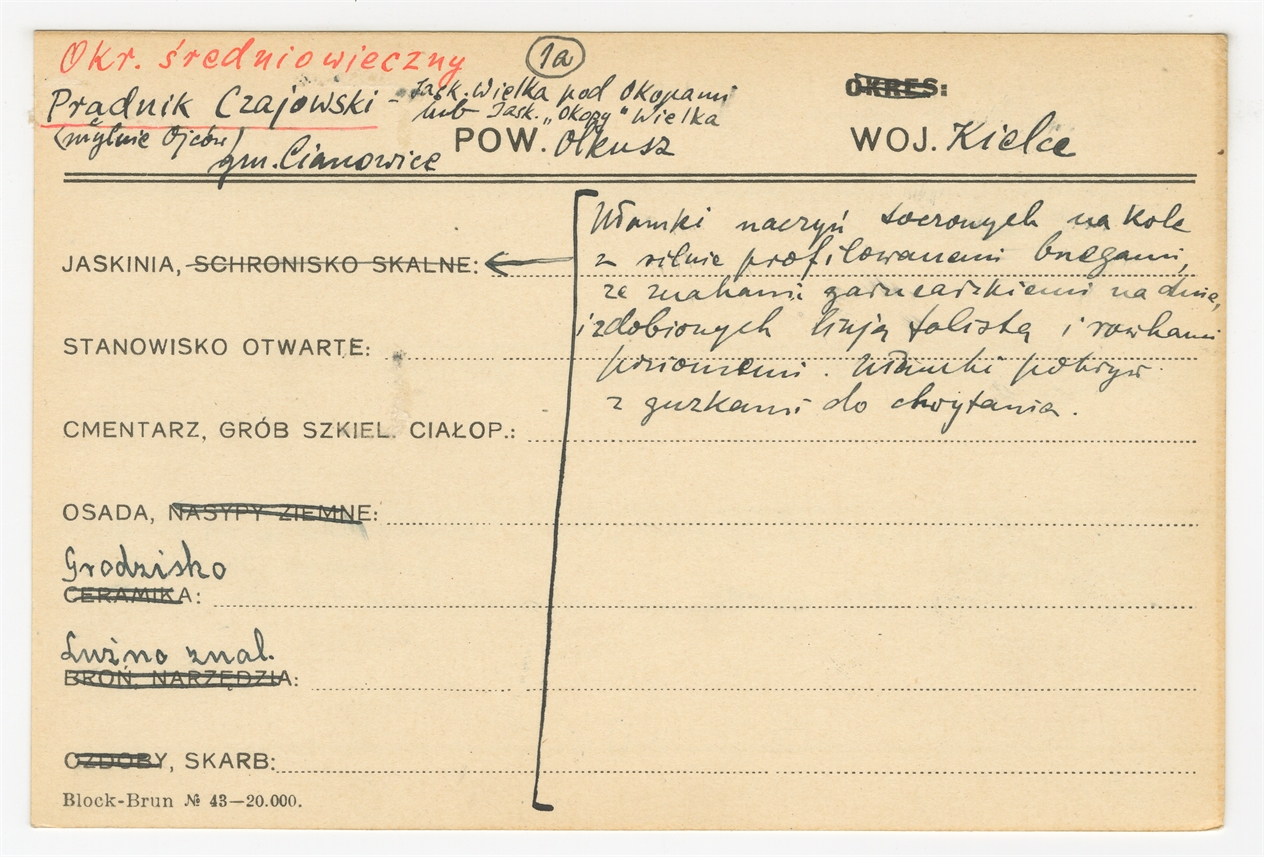 Karta stanowiska "Prądnik Czajkowski (mylnie Ojców) - Jask. Wielka pod Okopami lub Jask. "Okopy" Wielka gm. Cianowice pow. Olkusz woj. Kielce" (druk rękopis) - strona 1