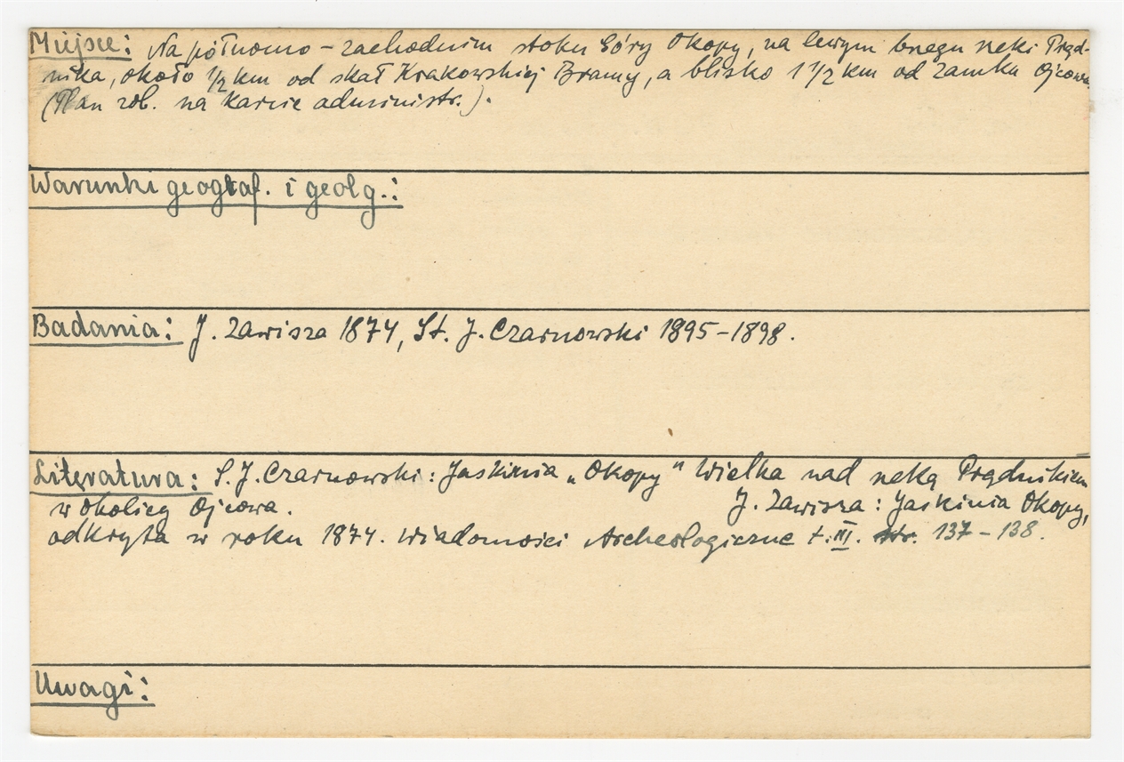 Karta stanowiska "Prądnik Czajkowski (mylnie Ojców) - Jask. Wielka pod Okopami lub Jask. "Okopy" Wielka gm. Cianowice pow. Olkusz woj. Kielce" (druk rękopis) - strona 2