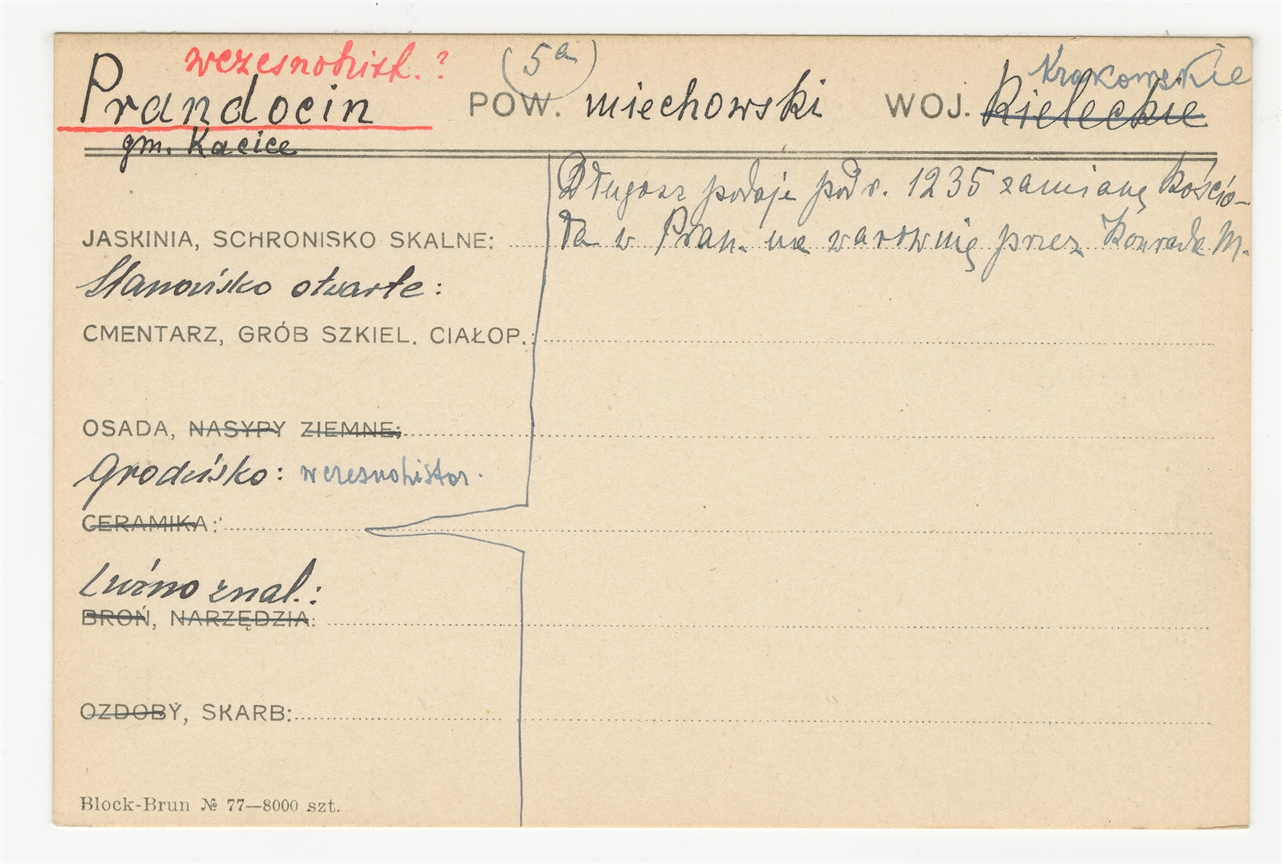 Karta stanowiska "Prandocin gm. Kacice pow. miechowski woj. Kieleckie [skreślone] Krakowskie (druk rękopis) - strona 1