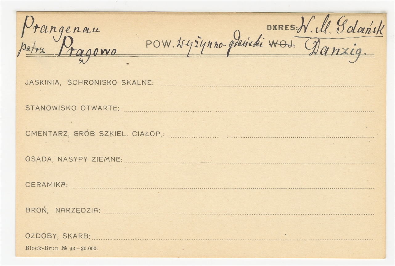 Karta stanowiska "Prangenau patrz Prągowo pow. wyżynno-gdański W.M. Gdańsk/Danzig" (druk rękopis) - strona 1