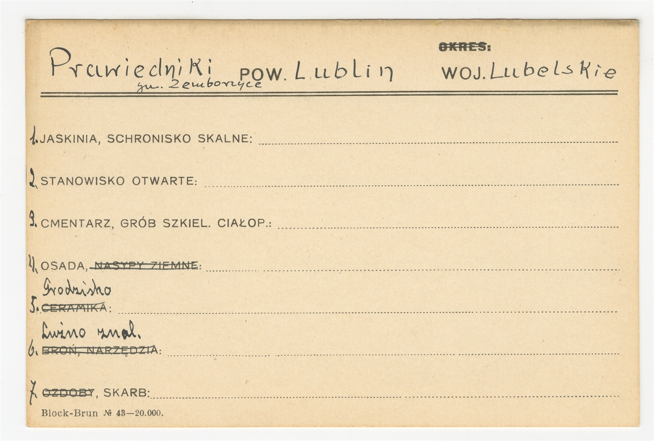 Karta stanowiska "Prawiedniki gm. Zemborzyce pow. Lublin woj. Lubelskie" (druk rękopis) - strona 1