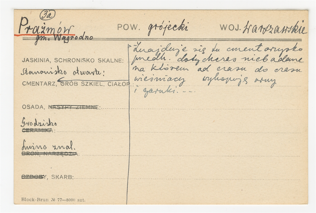 Karta stanowiska "Prażmów pow. Wągrodno pow. grójecki woj. warszawskie" (druk rękopis) - strona 1