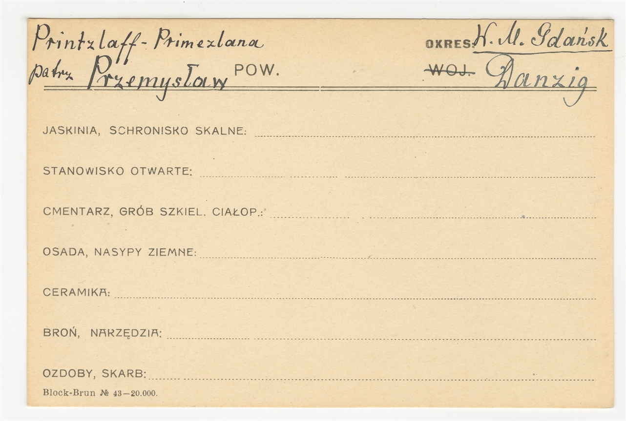 Element 1 - Karta stanowiska "Printzlaff-Primezlana patrz Przymysław W.M. Gdańsk/Danzig" (druk rękopis) - strona 1