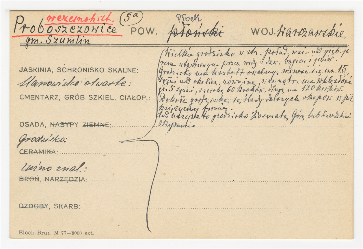 Element 1 - Karta stanowiska "Proboszczewice gm. Szumlin pow. płoński [skreślone] Płock woj. Warszawskie" (druk rękopis) - strona 1