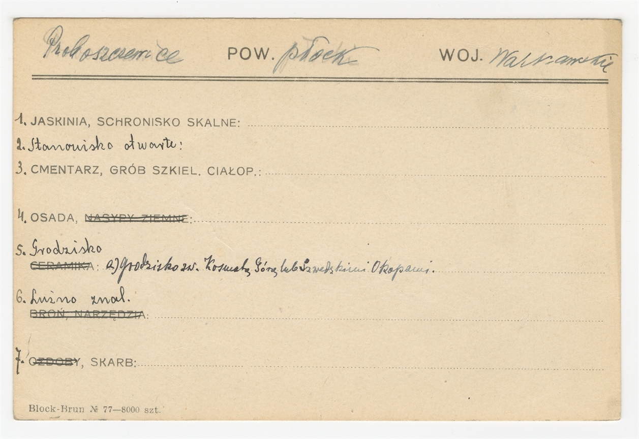 Karta stanowiska "Proboszczewice pow. Płock woj. Warszawskie" (druk rękopis) - strona 1