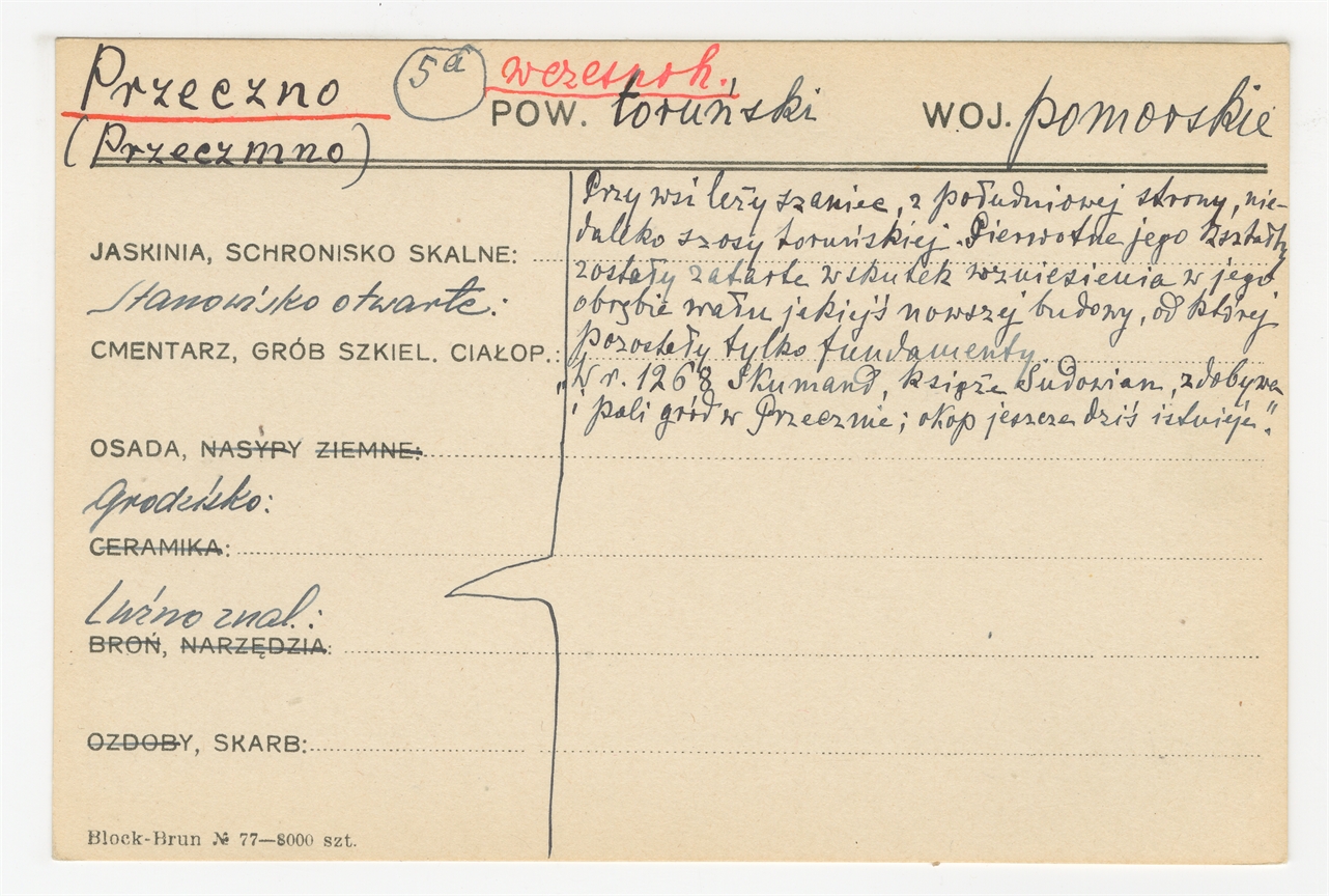 Karta stanowiska "Przeczno (Przeczmno) pow. toruński woj. pomorskie" (druk rękopis) - strona 1