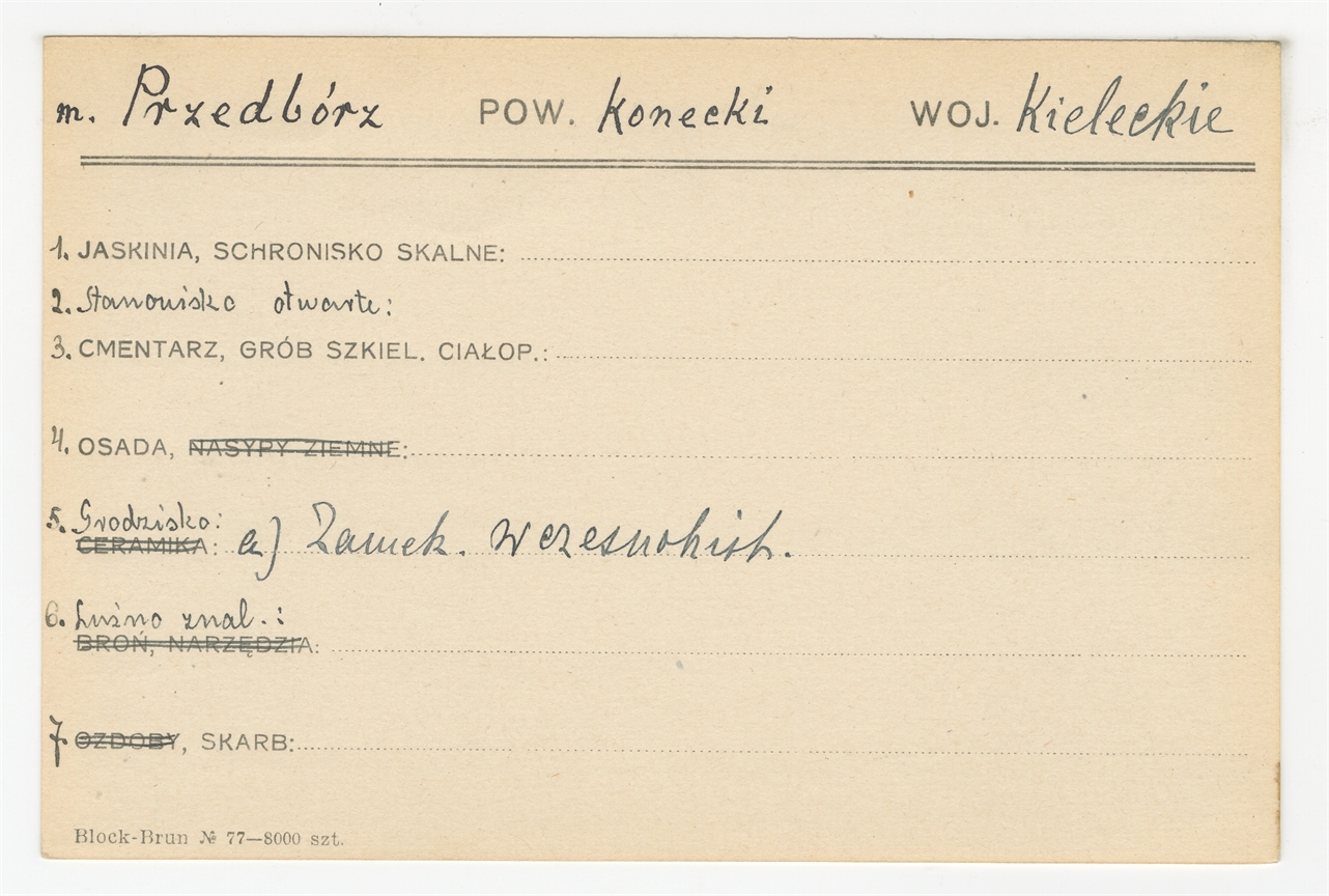 Karta stanowiska "Przedbórz pow. konecki woj. kieleckie" (druk rekopis) - strona 1