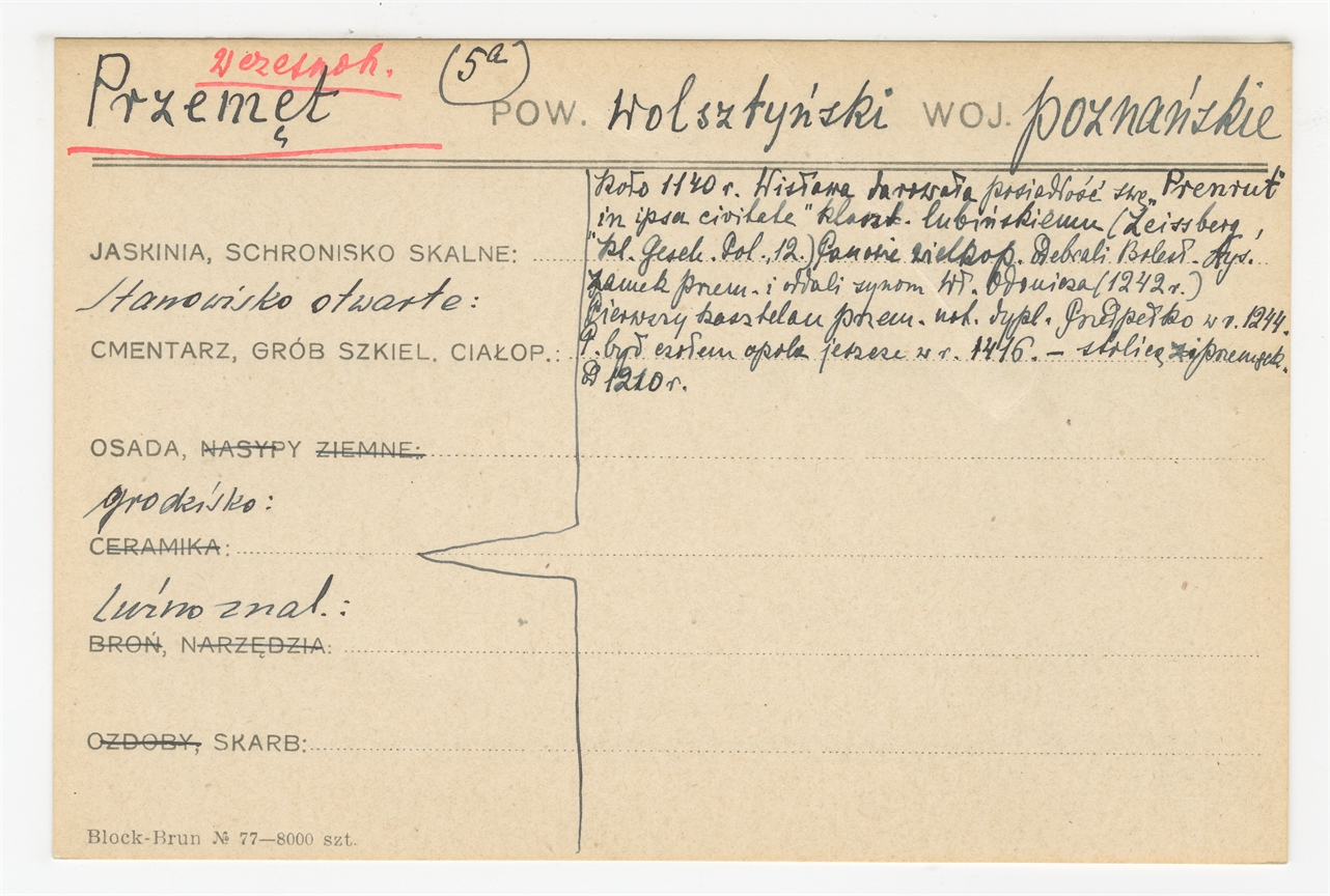 Karta stanowiska "Przemęt pow. wolsztyński woj. poznańskie (druk rękopis) - strona 1