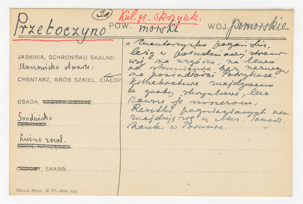 Karta stanowiska "Przetoczyno pow. morski woj. pomorskie" (druk rękopis) - strona 1