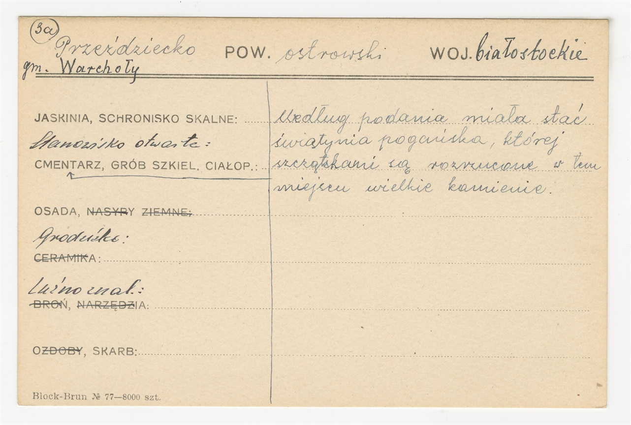 Karta stanowiska "Przeździecko gm. Warchoły pow. ostrowski woj. białostockie" (druk rękopis) - strona 1