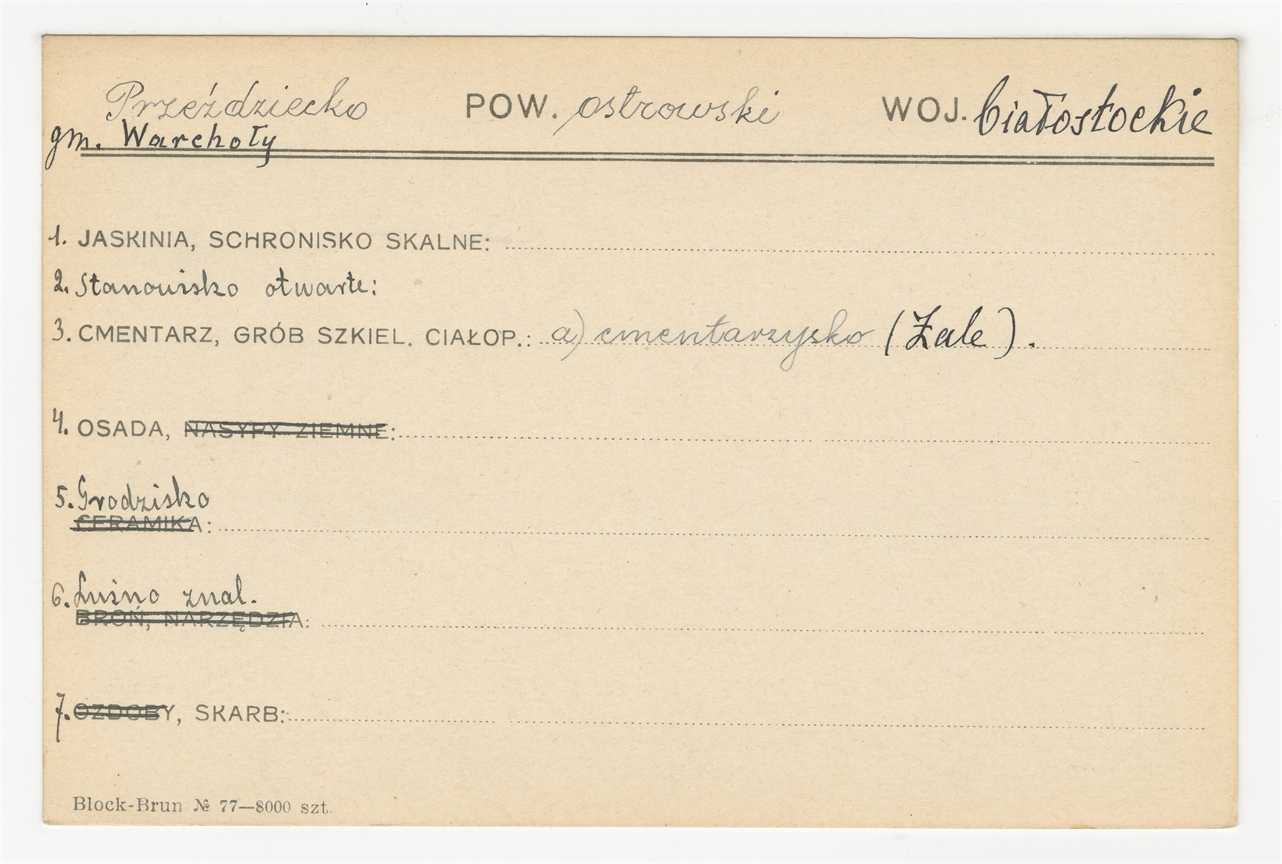 Karta stanowiska "Przeździecko gm. Warchoły pow. ostrowski woj. białostockie" (druk rękopis) - strona 1